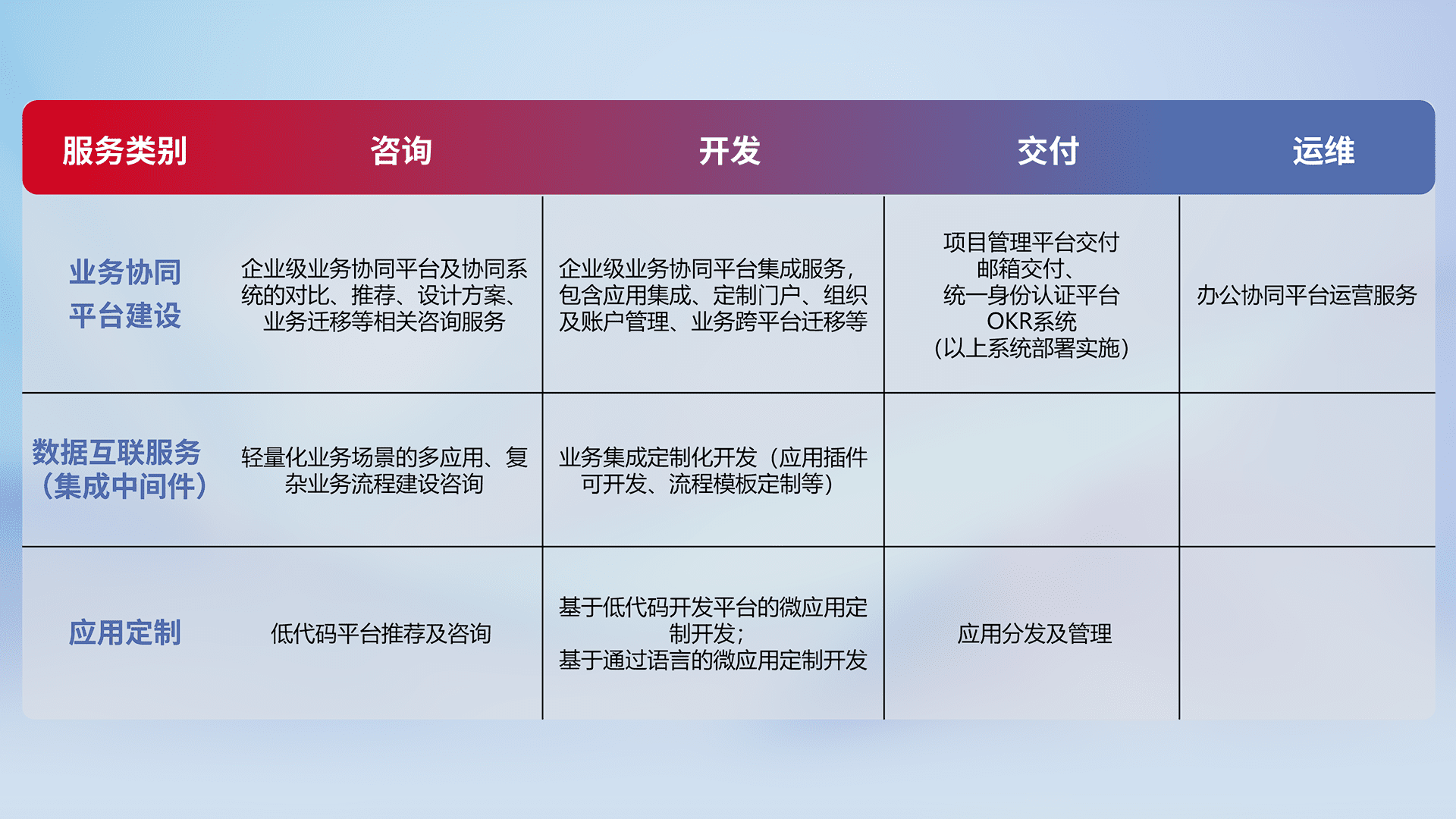 针对钉钉、、、、企微、、、、IDaas等平台级产品提供产品的规划、、、方案、、、交付、、、、定制化开发等服务,,,,实现如统一协同办公、、、智能客户服务、、、、混合会议管理、、智能数据查询、、等业务场景,,实现数字化转型。。