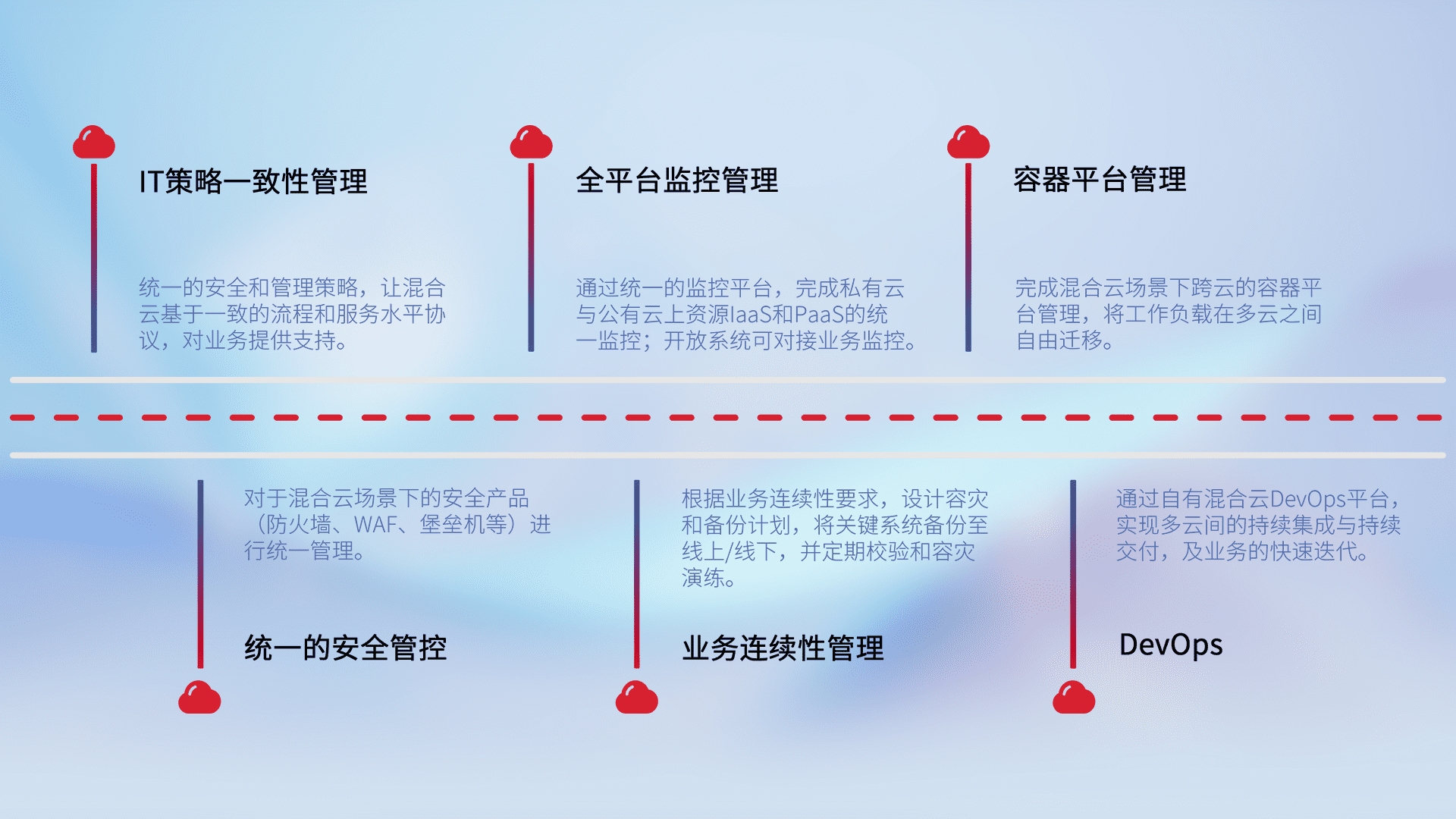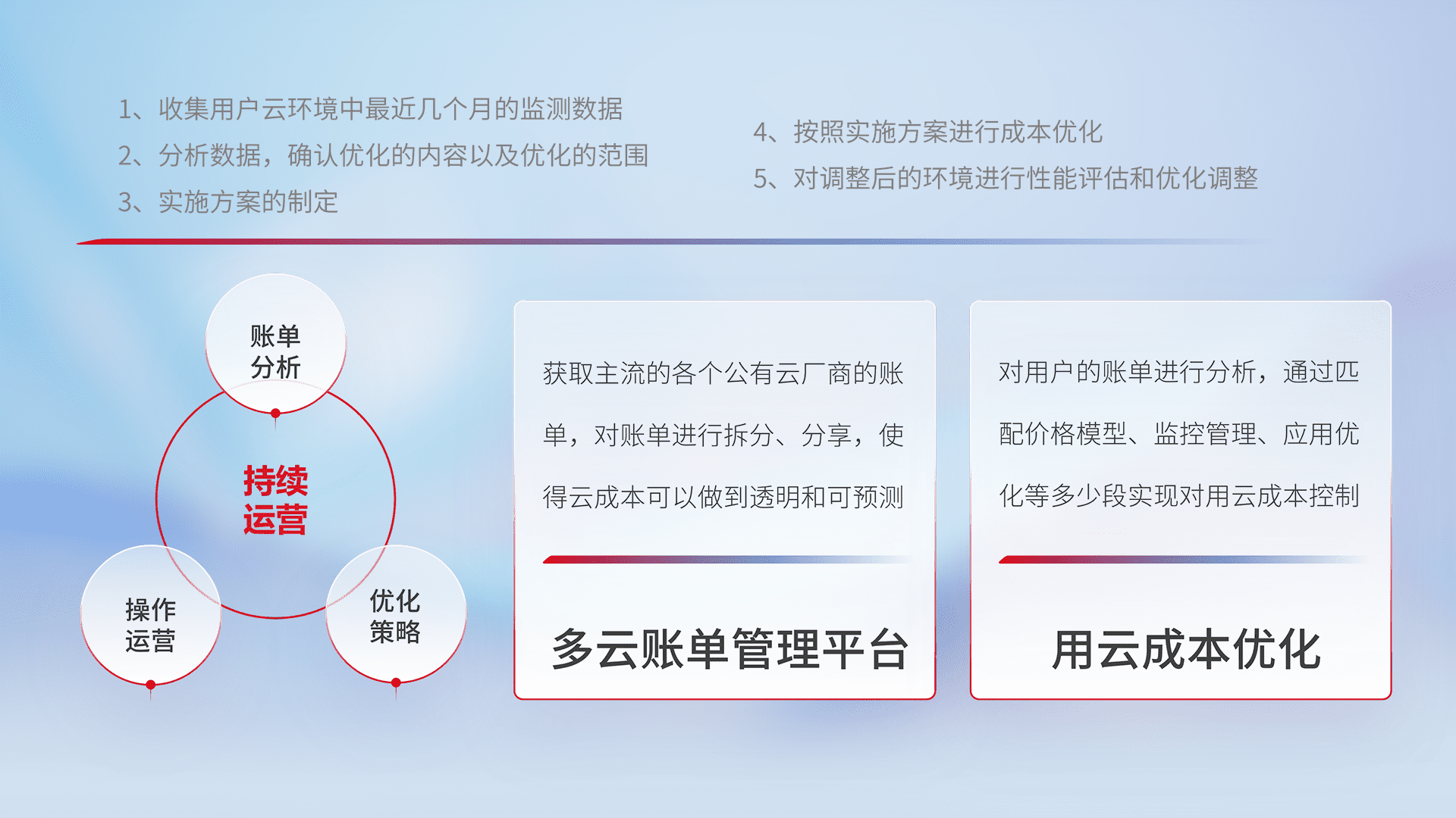 通过多云纳管,,以统一的资源数据模型把客户的云资源进行抽象和封装,,,进而实现对多云资源的统一操作,,,保障云资源管理的可靠性、、、稳定性与可用性。。。量身定制化运维内容,,,配置、、开发运维、、、补丁管理、、备份、、监控、、、、认证和访问管理、、、、审计和日常巡检等,,保障在用云过程中的可靠度,,稳定度以及高可用率。。。